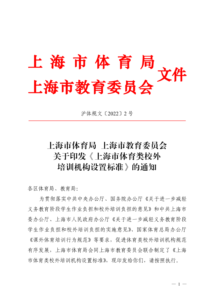 为贯彻落实中共中央办公厅、国务院办公厅《关于进一步减轻义务教育阶段学生作业负担和校外培训负担的意见》和中共上海市委办公厅、上海市人民政府办公厅《关于进一步减轻义务教育阶段学生作业负担和校外培训负担的实施意见》、国家体育总局办公厅《课外体育培训行为规范》等要求,促进体育类校外培训机构规范有序发展,上海市体育局会同上海市教育委员会联合制定了《上海市体育类校外培训机构设置标准》,现印发给你们,请按照执行。