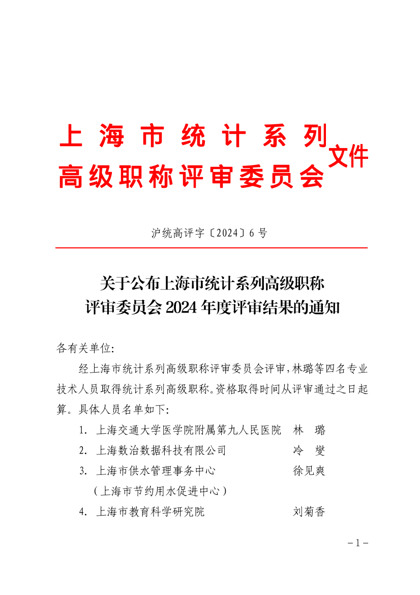 经上海市统计系列高级职称评审委员会评审,林璐等四名专业技术人员取得统计系列高级职称。资格取得时间从评审通过之日起算。具体人员名单如下: