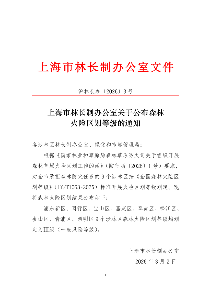 浦东新区、闵行区、宝山区、嘉定区、奉贤区、松江区、金山区、青浦区、崇明区9个涉林区森林火险区划等级均划定为Ⅲ级(一般风险等级)。