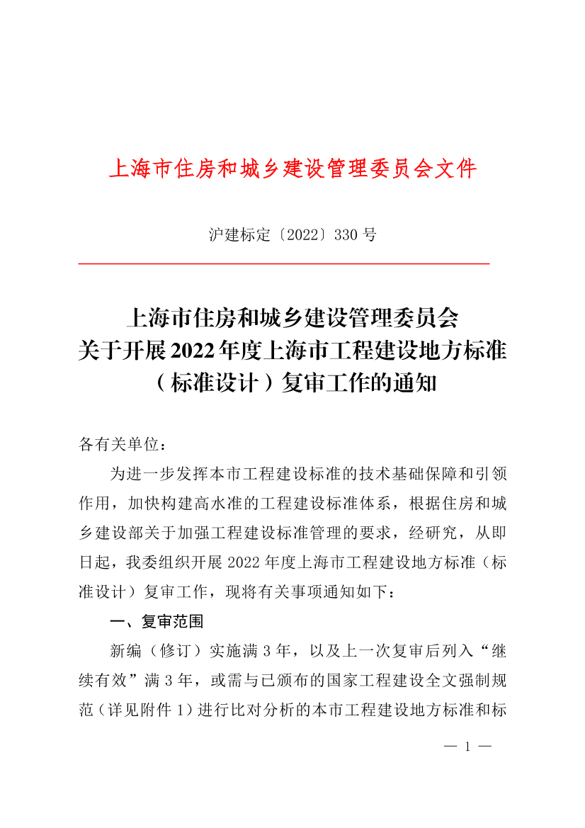 为进一步发挥本市工程建设标准的技术基础保障和引领作用,加快构建高水准的工程建设标准体系,根据住房和城乡建设部关于加强工程建设标准管理的要求,经研究,从即日起,我委组织开展2022年度上海市工程建设地方标准(标准设计)复审工作,现将有关事项通知如下: