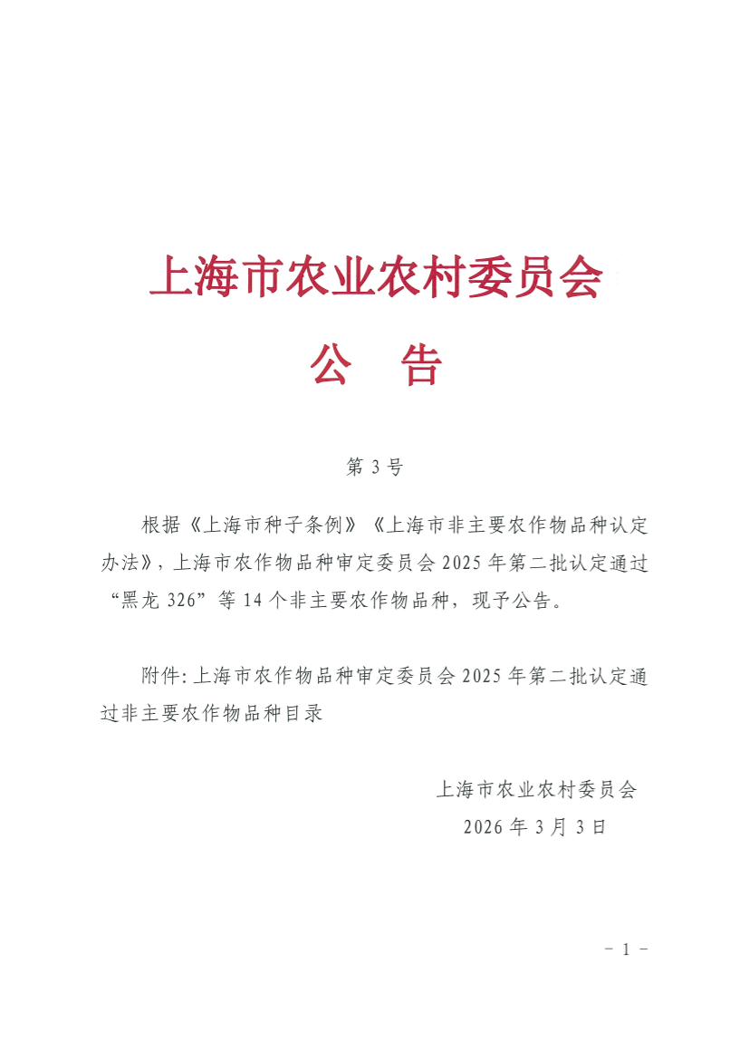 根据《上海市种子条例》《上海市非主要农作物品种认定办法》,上海市农作物品种审定委员会2025年第二批认定通过“黑龙326”等14个非主要农作物品种,现予公告。