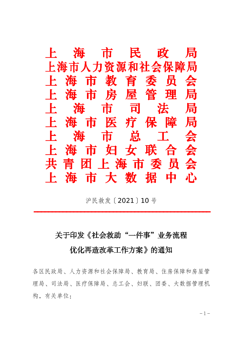 为进一步深入推进“一网通办”,方便困难群众申领各类社会救助服务,推动社会救助“一件事”业务流程深度融合。按照《2021年上海市深化“一网通办”改革工作要点》(沪委办〔2021〕8号)、《2021年上海市深化“放管服”改革工作要点》(沪府办〔2021〕12号)和《以企业和群众高效办成“一件事”为目标全面推进业务流程革命性再造的指导意见》(沪府办〔2020〕6号)等文件要求,现就社会救助“一件事”业务流程优化再造改革工作制定方案如下: