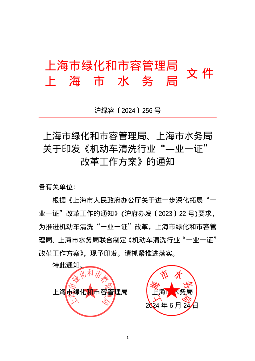 业一证”改革工作的通知》(沪府办发〔2023〕22号)要求,为推进机动车清洗“一业一证”改革,上海市绿化和市容管理局、上海市水务局联合制定《机动车清洗行业“一业一证”改革工作方案》,现予印发。请抓紧推进落实。