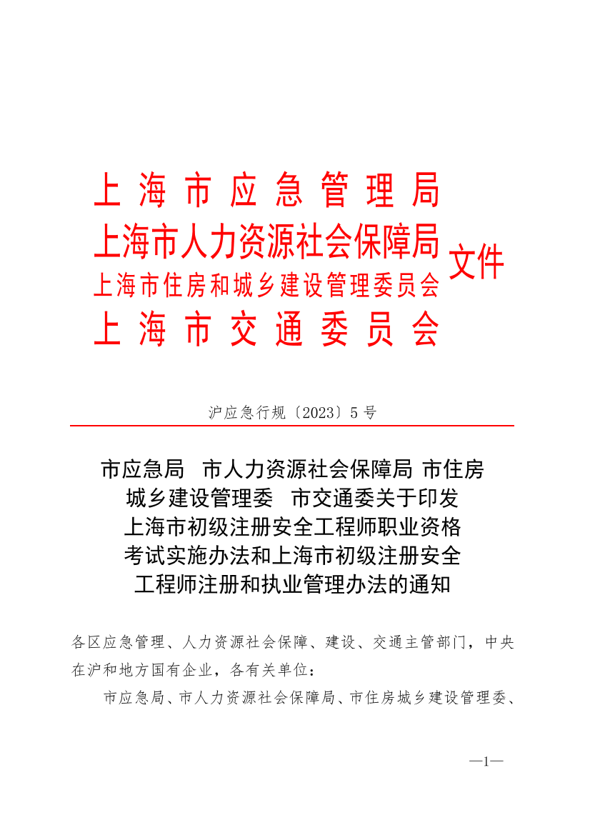 市应急局、市人力资源社会保障局、市住房城乡建设管理委、市交通委联合制定了《上海市初级注册安全工程师职业资格考试实施办法》和《上海市初级注册安全工程师注册和执业管理办法》,现印发给你们,请遵照执行。