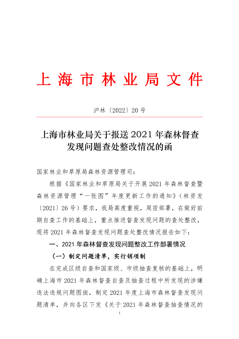 在完成区级自查和国家级、市级抽查复核的基础上,明确上海市2021年森林督查自查及抽查过程中所发现的涉嫌违法违规问题图斑,制定2021年度上海市森林督查发现问题清单,并向各区下发《关于2021年森林督查抽查情况的反馈意见》,要求各区针对涉嫌违法违规问题图斑进一步调查核实,确认为违法的必须严肃查处,待“三个到位”后予以销项,确保森林督查工作取得实效。