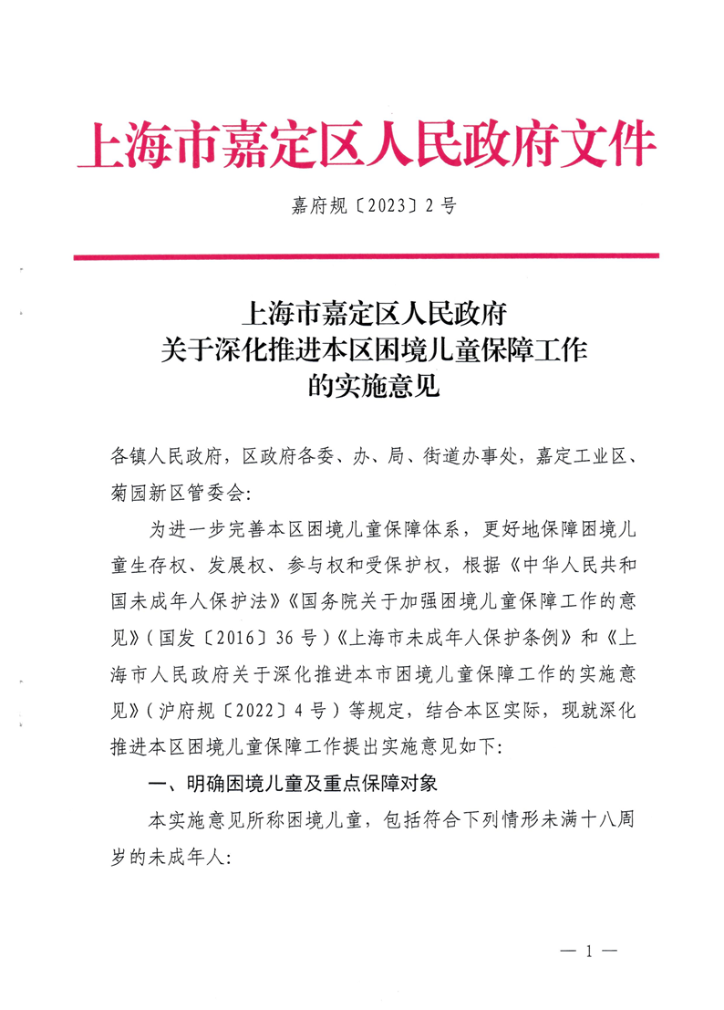 为进一步完善本区困境儿童保障体系,更好地保障困境儿童生存权、发展权、参与权和受保护权,根据《中华人民共和国未成年人保护法》《国务院关于加强困境儿童保障工作的意见》(国发〔2016〕36号)《上海市未成年人保护条例》和《上海市人民政府关于深化推进本市困境儿童保障工作的实施意见》(沪府规〔2022〕4号)等规定,结合本区实际,现就深化推进本区困境儿童保障工作提出实施意见如下: