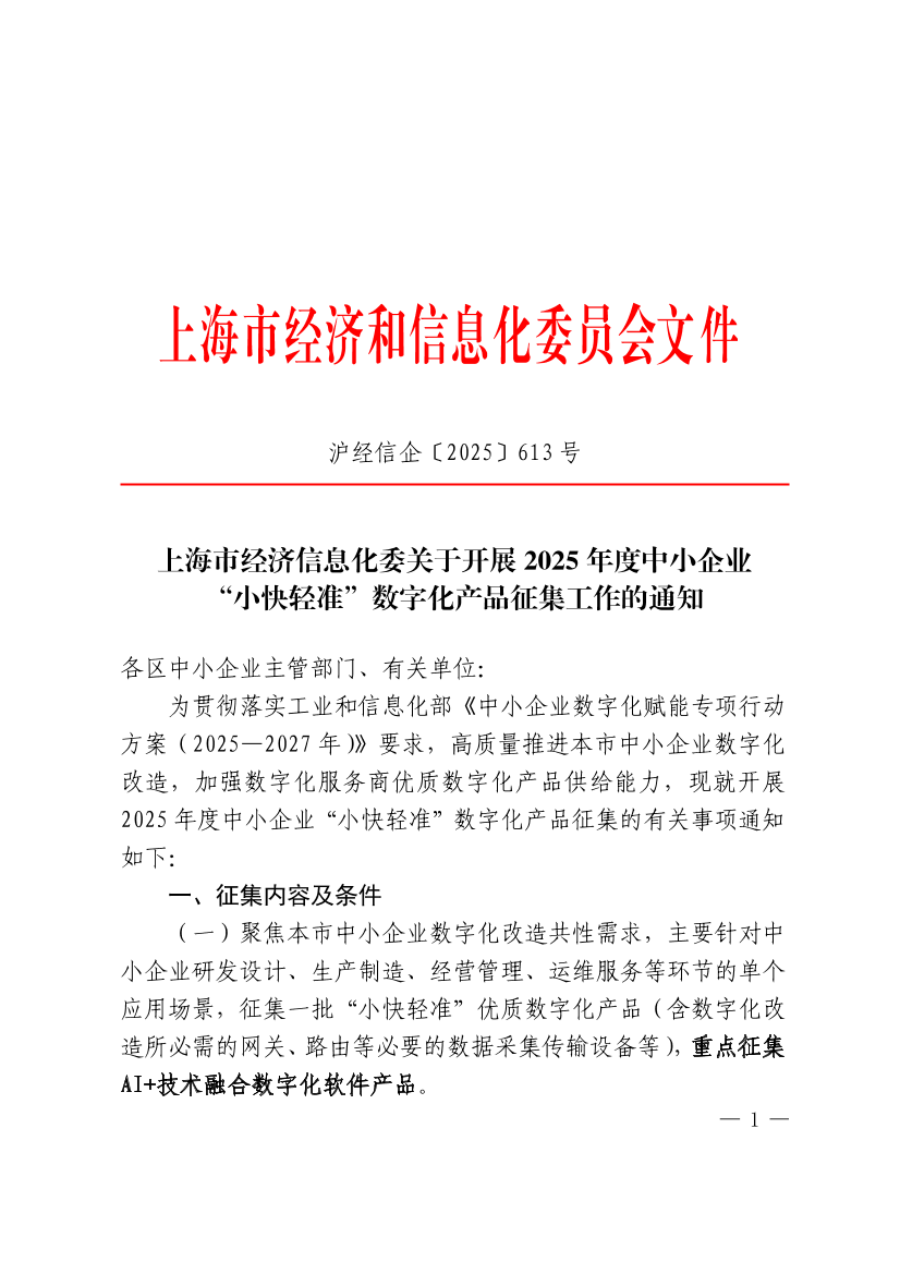 为贯彻落实工业和信息化部《中小企业数字化赋能专项行动方案(2025—2027年)》要求,高质量推进本市中小企业数字化改造,加强数字化服务商优质数字化产品供给能力,现就开展2025年度中小企业“小快轻准”数字化产品征集的有关事项通知如下: