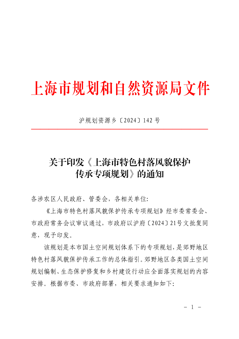 《上海市特色村落风貌保护传承专项规划》经市委常委会、市政府常务会议审议通过,市政府以沪府〔2024〕21号文批复同意,现予印发。