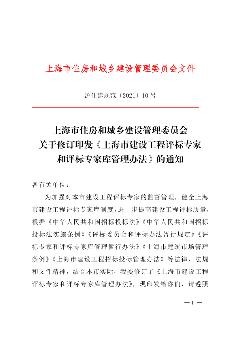 关于修订印发《上海市建设工程评标专家和评标专家库管理办法》的通知