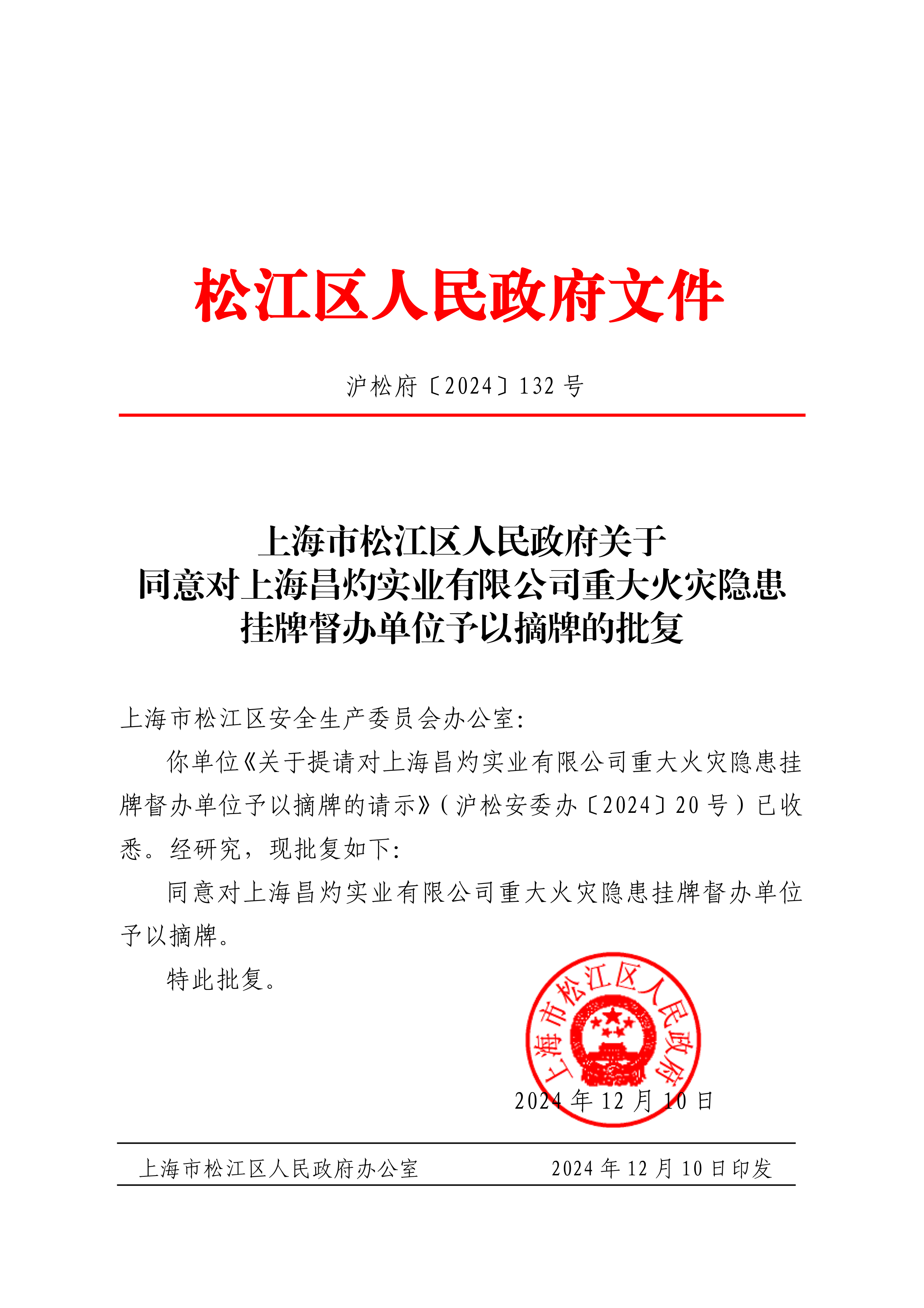 你单位《关于提请对上海昌灼实业有限公司重大火灾隐患挂牌督办单位予以摘牌的请示》(沪松安委办〔2024〕20号)已收悉。经研究,现批复如下: