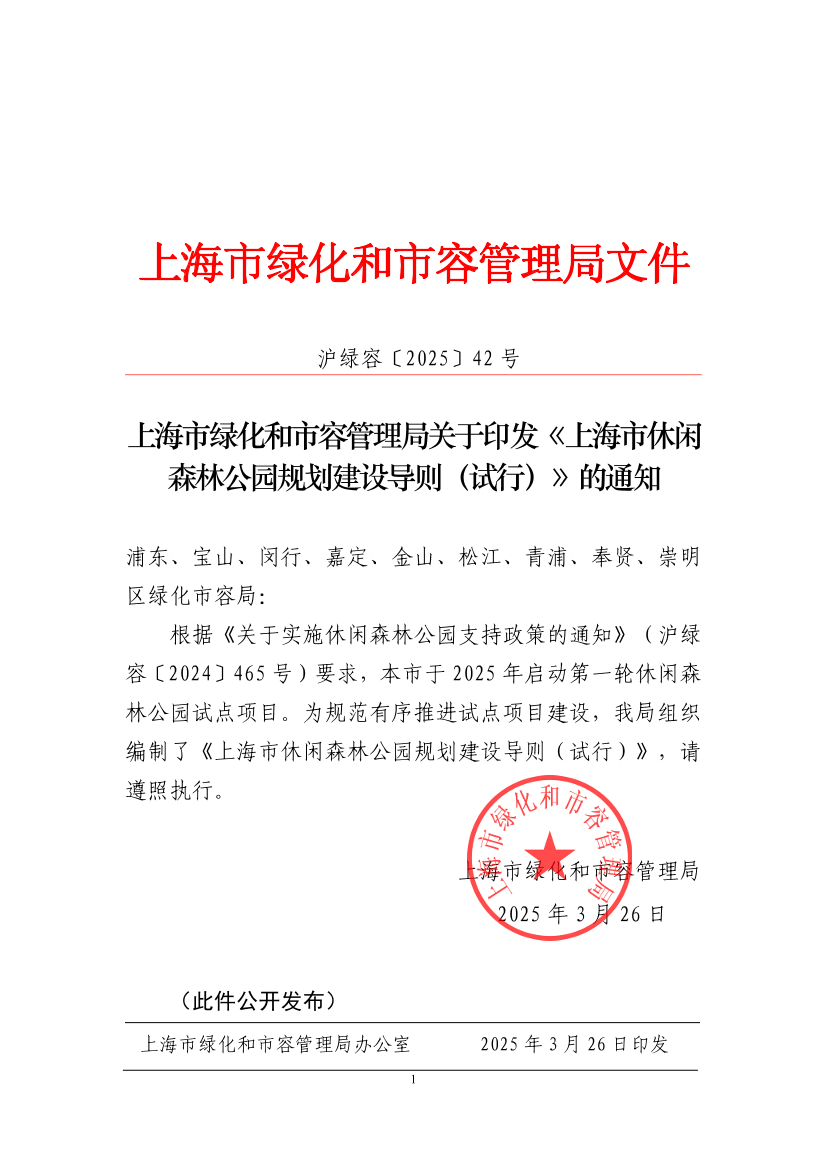 根据《关于实施休闲森林公园支持政策的通知》(沪绿容〔2024〕465 号)要求,本市于2025年启动第一轮休闲森林公园试点项目。为规范有序推进试点项目建设,我局组织编制了《上海市休闲森林公园规划建设导则(试行)》,请遵照执行。