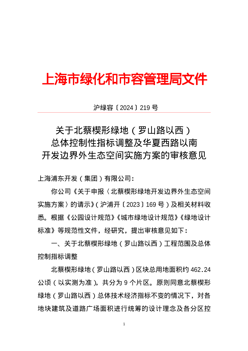 一、关于北蔡楔形绿地(罗山路以西)工程范围及总体控制指标调整