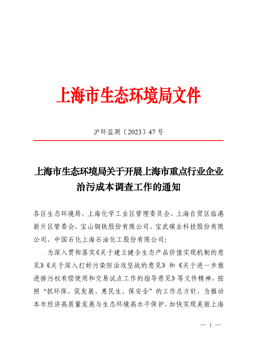 为深入贯彻落实《关于建立健全生态产品价值实现机制的意见》《关于深入打好污染防治攻坚战的意见》和《关于进一步推进排污权有偿使用和交易试点工作的指导意见》等文件精神,按照“抓环保、促发展、惠民生、保安全”的工作总方针,为推动本市经济高质量发展与生态环境高水平保护,加快实现美丽上海的建设目标,有序科学开展上海市排污权有偿使用和交易综合试点的制度设计,现就本市开展重点行业企业治污成本调查工作有关要求通知如下。