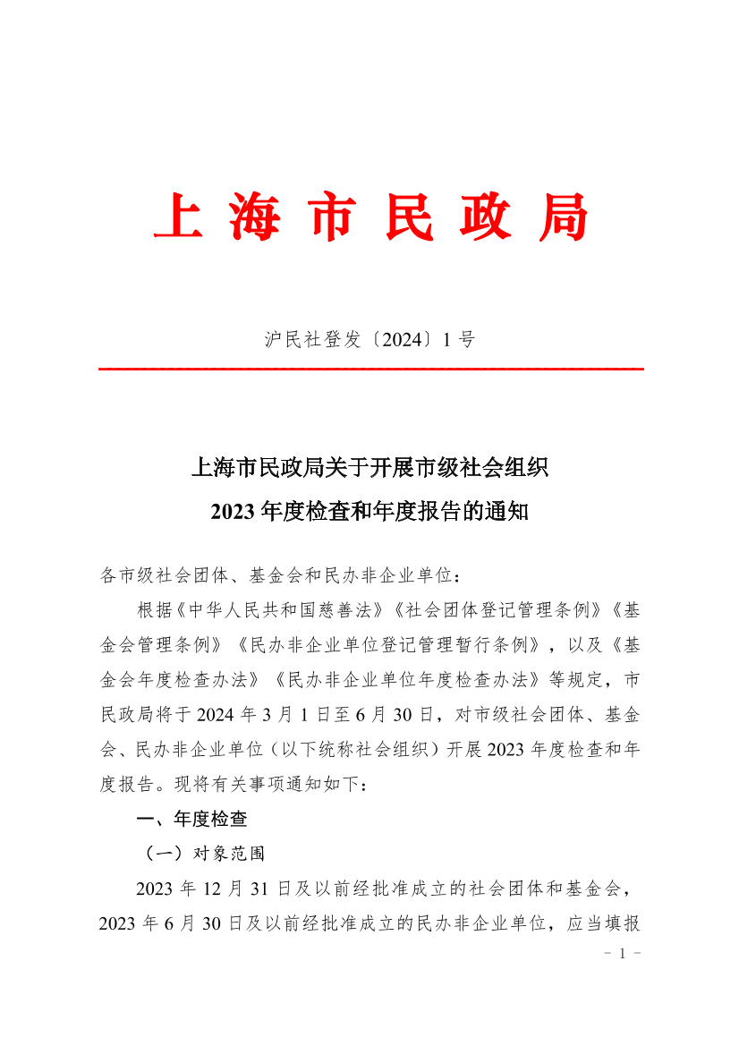 根据《中华人民共和国慈善法》《社会团体登记管理条例》《基金会管理条例》《民办非企业单位登记管理暂行条例》,以及《基金会年度检查办法》《民办非企业单位年度检查办法》等规定,市民政局将于2024年3月1日至6月30日,对市级社会团体、基金会、民办非企业单位(以下统称社会组织)开展2023年度检查和年度报告。现将有关事项通知如下: