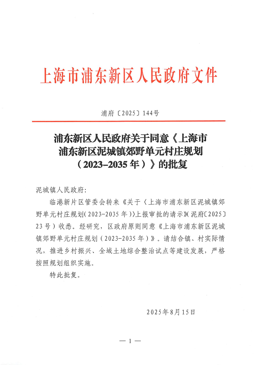 临港新片区管委会转来《关于〈上海市浦东新区泥城镇郊野单元村庄规划(2023-2035年)〉上报审批的请示》(泥府〔2025〕23号)收悉。经研究,区政府原则同意《上海市浦东新区泥城镇郊野单元村庄规划(2023-2035年)》。请结合镇、村实际情况,推进乡村振兴、全域土地综合整治试点等建设发展,严格按照规划组织实施。