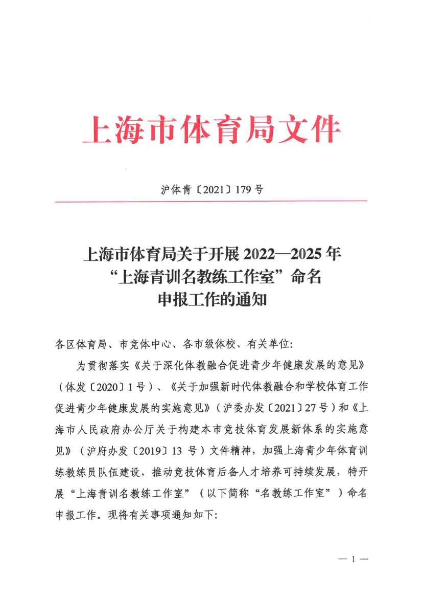 为贯彻落实《关于深化体教融合促进青少年健康发展的意见》(体发〔2020〕1号)、《关于加强新时代体教融合和学校体育工作 促进青少年健康发展的实施意见》(沪委办发〔2021〕27号)和《上海市人民政府办公厅关于构建本市竞技体育发展新体系的实施意见》(沪府办发〔2019〕13号)文件精神,加强上海青少年体育训练教练员队伍建设,推动竞技体育后备人才培养可持续发展,特开展“上海青训名教练工作室”(以下简称“名教练工作室”)命名申报工作。现将有关事项通知如下: