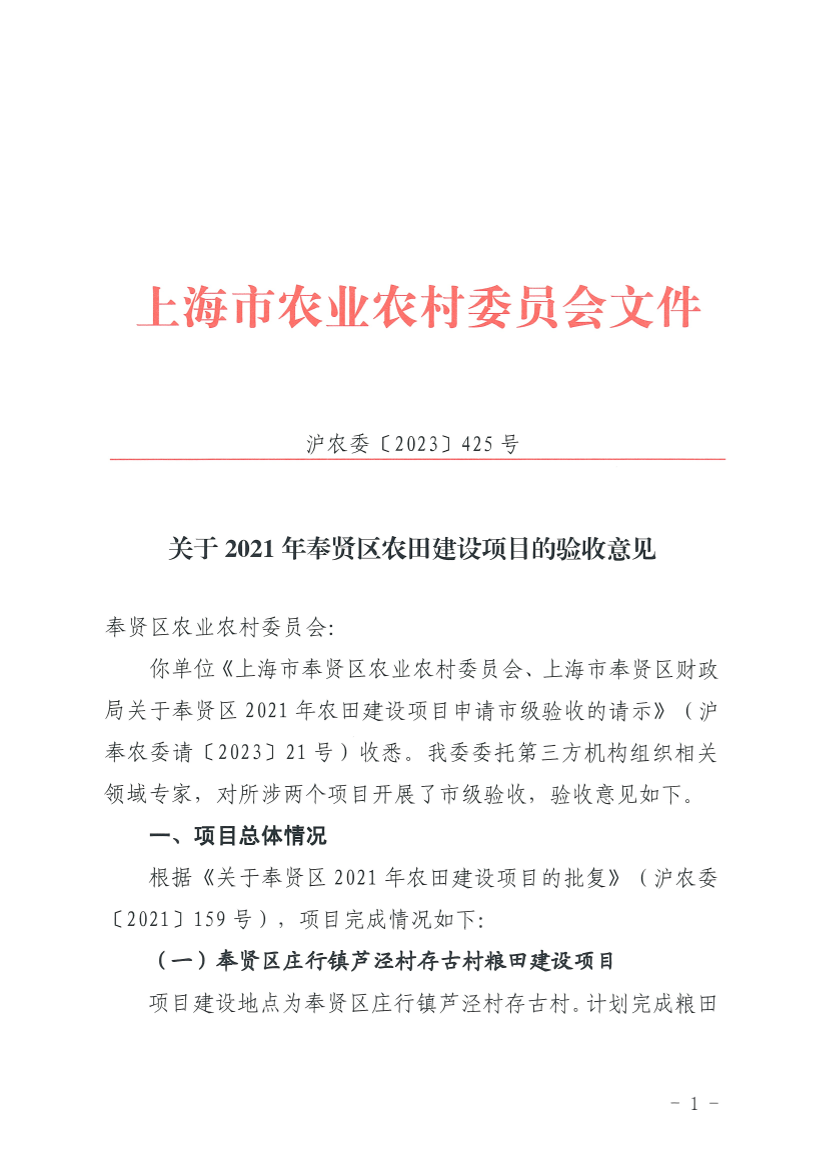 你单位《上海市奉贤区农业农村委员会、上海市奉贤区财政局关于奉贤区2021年农田建设项目申请市级验收的请示》(沪奉农委请〔2023〕21号)收悉。我委委托第三方机构组织相关领域专家,对所涉两个项目开展了市级验收,验收意见如下。