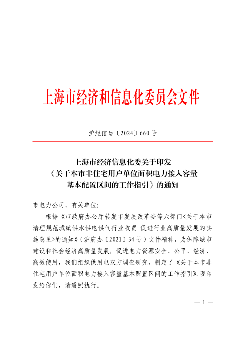 根据《市政府办公厅转发市发展改革委等六部门<关于本市清理规范城镇供水供电供气行业收费 促进行业高质量发展的实施意见>的通知》(沪府办〔2021〕34号)文件精神,为保障城市建设和社会经济高质量发展,促进电力资源安全、公平、经济、高效使用,我们组织供用电双方调查研究,制定了《关于本市非住宅用户单位面积电力接入容量基本配置区间的工作指引》。现印发给你们,请遵照执行。