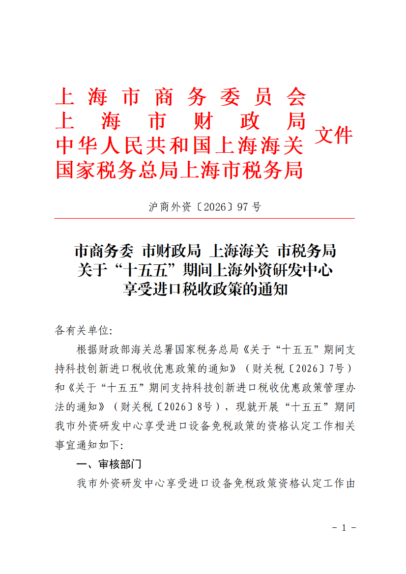 根据财政部海关总署国家税务总局《关于“十五五”期间支持科技创新进口税收优惠政策的通知》(财关税〔2026〕7号)和《关于“十五五”期间支持科技创新进口税收优惠政策管理办法的通知》(财关税〔2026〕8号),现就开展“十五五”期间我市外资研发中心享受进口设备免税政策的资格认定工作相关事宜通知如下: