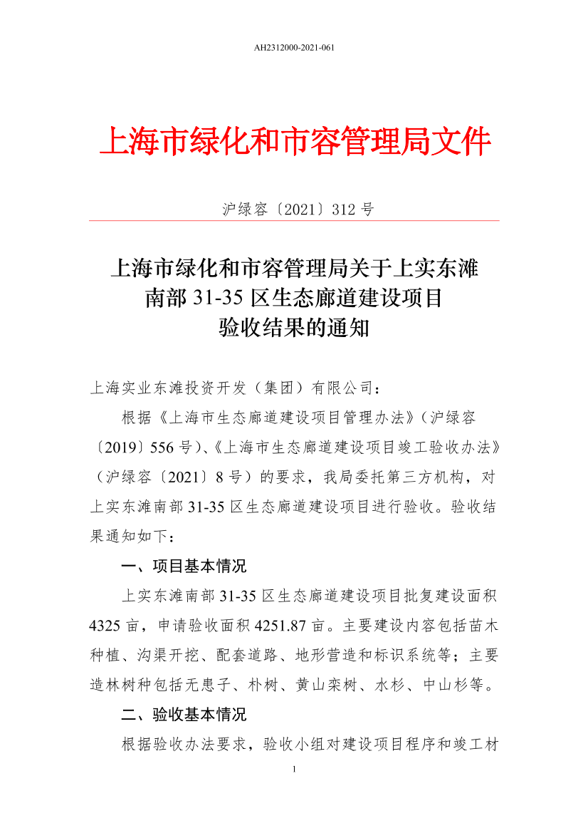 根据《上海市生态廊道建设项目管理办法》(沪绿容〔2019〕556号)、《上海市生态廊道建设项目竣工验收办法》(沪绿容〔2021〕8号)的要求,我局委托第三方机构,对上实东滩南部31-35区生态廊道建设项目进行验收。验收结果通知如下:
