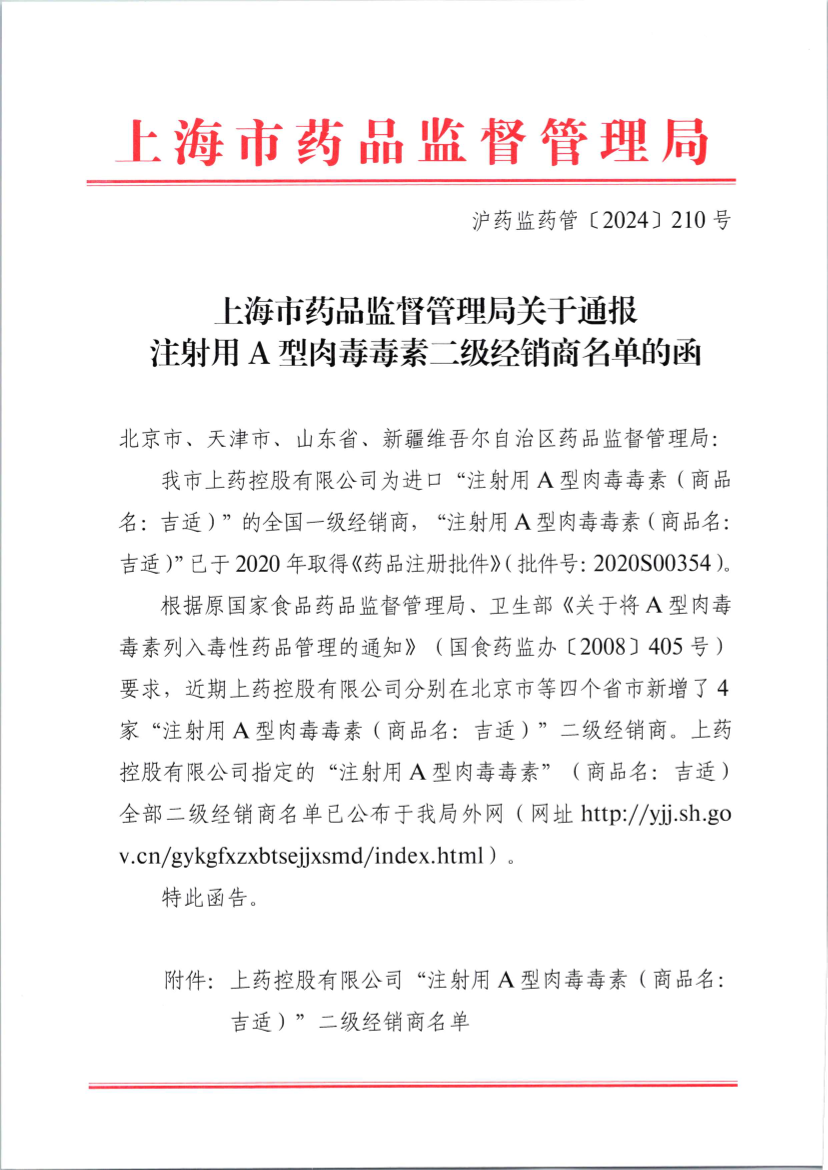 根据原国家食品药品监督管理局、卫生部《关于将A型肉毒毒素列入毒性药品管理的通知》(国食药监办〔2008〕405号)要求,近期上药控股有限公司分别在北京市等四个省市新增了4家“注射用A型肉毒毒素(商品名:吉适)”二级经销商。上药控股有限公司指定的“注射用A型肉毒毒素”(商品名:吉适)全部二级经销商名单已公布于我局外网(网址http://yjj.sh.gov.cn/gykgfxzxbtsejjxsmd/index.html)。