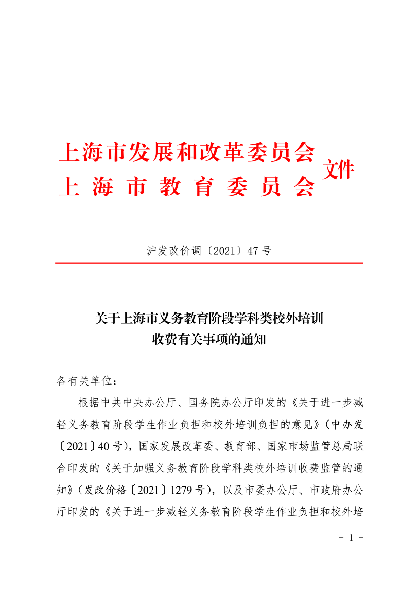 根据中共中央办公厅、国务院办公厅印发的《关于进一步减轻义务教育阶段学生作业负担和校外培训负担的意见》(中办发〔2021〕40号),国家发展改革委、教育部、国家市场监管总局联合印发的《关于加强义务教育阶段学科类校外培训收费监管的通知》(发改价格〔2021〕1279号),以及市委办公厅、市政府办公厅印发的《关于进一步减轻义务教育阶段学生作业负担和校外培训负担的实施意见》(沪委办发〔2021〕26 号)等要求,为有效减轻义务教育阶段学生过重校外培训负担,现就本市义务教育阶段学科类校外培训收费有关事项通知如下: