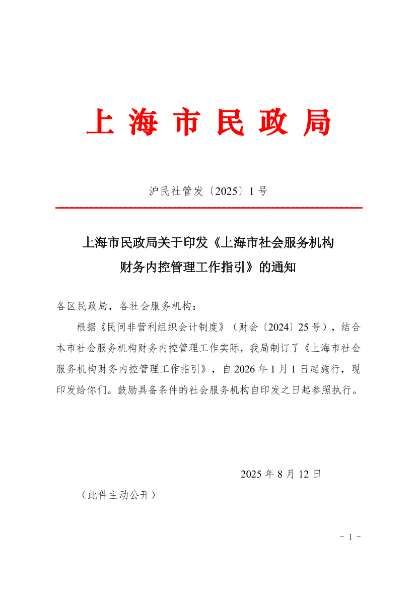 根据《民间非营利组织会计制度》(财会〔2024〕25号),结合本市社会服务机构财务内控管理工作实际,我局制订了《上海市社会服务机构财务内控管理工作指引》,自2026年1月1日起施行,现印发给你们。鼓励具备条件的社会服务机构自印发之日起参照执行。