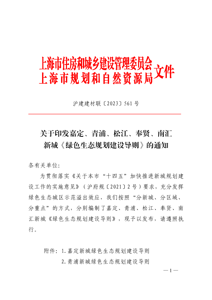 为贯彻落实《关于本市“十四五”加快推进新城规划建设工作的实施意见》(沪府规〔2021〕2号)要求,充分发挥绿色生态城区示范溢出效应,我们按照“分新城、分区域、分重点”的方式,分别编制了嘉定、青浦、松江、奉贤、南汇新城《绿色生态规划建设导则》,现予以发布,请遵照执行。