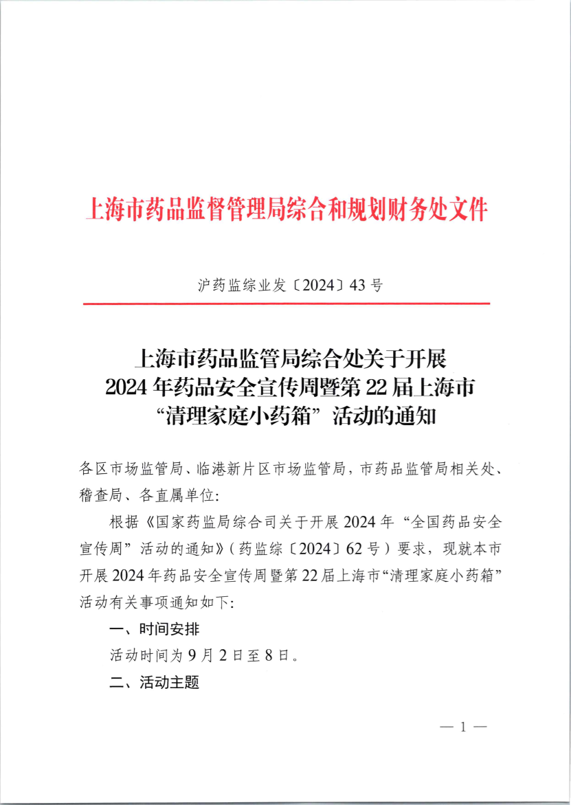 根据《国家药监局综合司关于开展2024年“全国药品安全宣传周”活动的通知》(药监综〔2024〕62号)要求,现就本市开展2024年药品安全宣传周暨第22届上海市“清理家庭小药箱”活动有关事项通知如下: