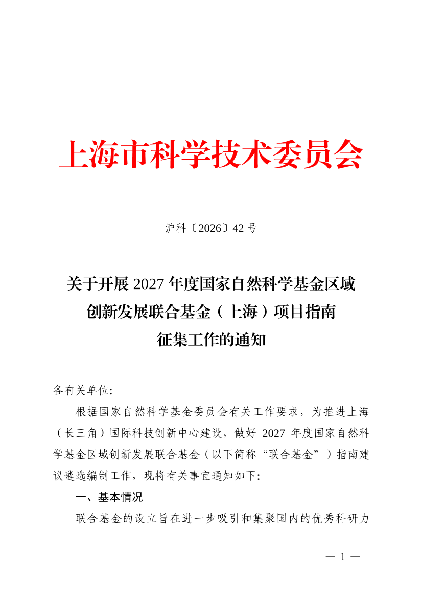 根据国家自然科学基金委员会有关工作要求,为推进上海(长三角)国际科技创新中心建设,做好2027年度国家自然科学基金区域创新发展联合基金(以下简称“联合基金”)指南建议遴选编制工作,现将有关事宜通知如下:
