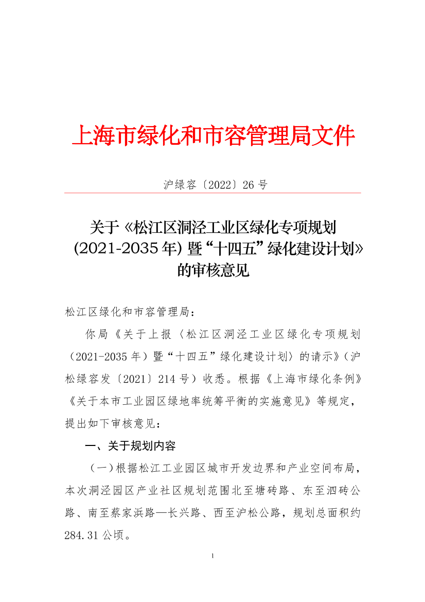你局《关于上报〈松江区洞泾工业区绿化专项规划(2021-2035年)暨“十四五”绿化建设计划〉的请示》(沪松绿容发〔2021〕214号)收悉。根据《上海市绿化条例》《关于本市工业园区绿地率统筹平衡的实施意见》等规定,提出如下审核意见: