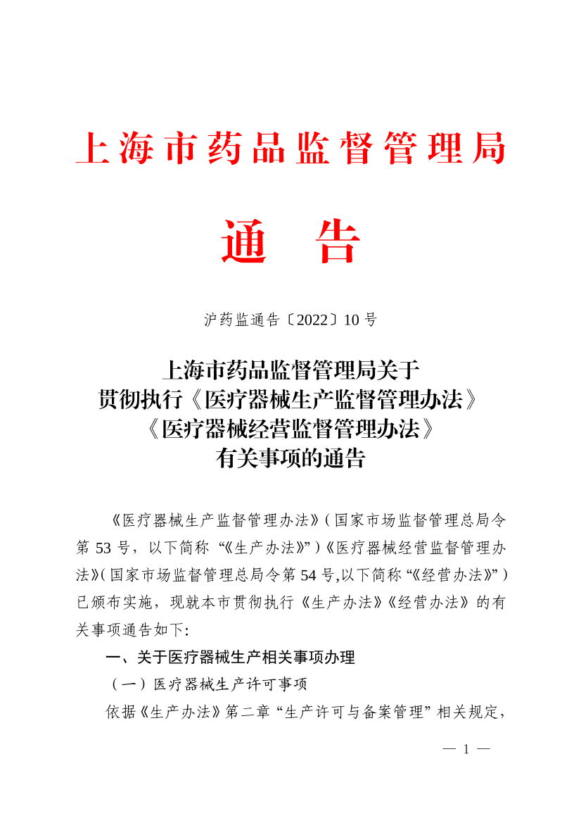 《医疗器械生产监督管理办法》(国家市场监督管理总局令第53号,以下简称“《生产办法》”)《医疗器械经营监督管理办法》(国家市场监督管理总局令第54号,以下简称“《经营办法》”)已颁布实施,现就本市贯彻执行《生产办法》《经营办法》的有关事项通告如下: