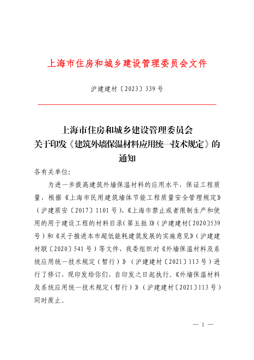 为进一步提高建筑外墙保温材料的应用水平,保证工程质量,根据《上海市民用建筑墙体节能工程质量安全管理规定》(沪建质安〔 2017〕1101号)、《上海市禁止或者限制生产和使用的用于建设工程的材料目录(第五批)》(沪建建材〔2020〕539号)和《关于推进本市超低能耗建筑发展的实施意见》(沪建建材联〔 2020〕541号)等文件,我委组织对《外墙保温材料及系统应用统一技术规定(暂行)》(沪建建材〔 2021〕113号)进行了修订,现印发给你们,自印发之日起执行。《外墙保温材料及系统应用统一技术规定(暂行)》(沪建建材〔 2021〕113号)同时废止。