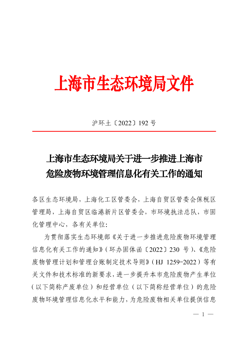 附件:1.《关于进一步推进危险废物环境管理信息化有关工作的通知》(环办固体函〔2022〕230号)
