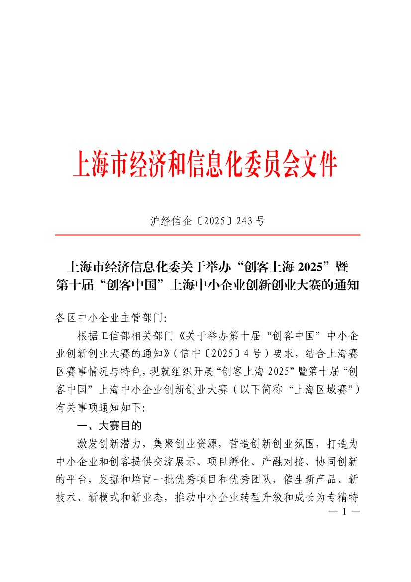 根据工信部相关部门《关于举办第十届“创客中国”中小企业创新创业大赛的通知》(信中〔2025〕4 号)要求,结合上海赛区赛事情况与特色,现就组织开展“创客上海2025”暨第十届“创客中国”上海中小企业创新创业大赛(以下简称“上海区域赛”)有关事项通知如下: