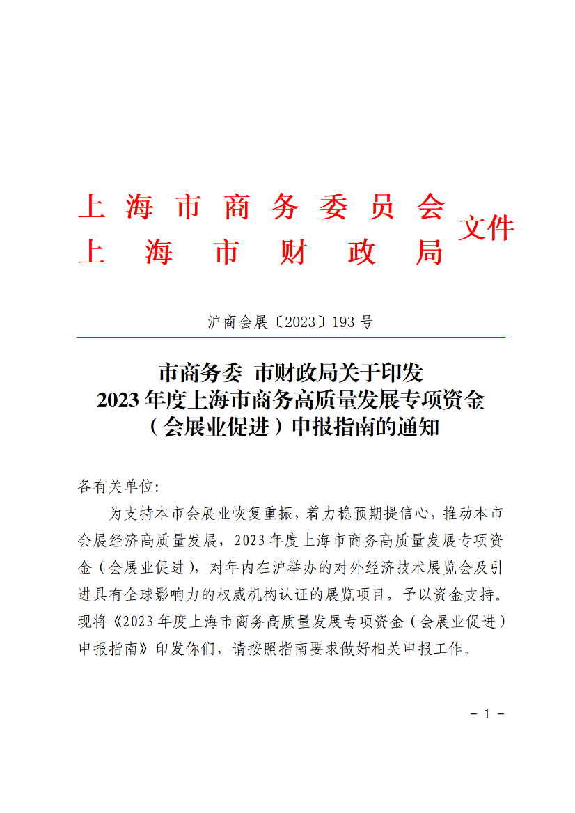 为支持本市会展业恢复重振,着力稳预期提信心,推动本市会展经济高质量发展,2023年度上海市商务高质量发展专项资金(会展业促进),对年内在沪举办的对外经济技术展览会及引进具有全球影响力的权威机构认证的展览项目,予以资金支持。现将《2023年度上海市商务高质量发展专项资金(会展业促进)申报指南》印发你们,请按照指南要求做好相关申报工作。