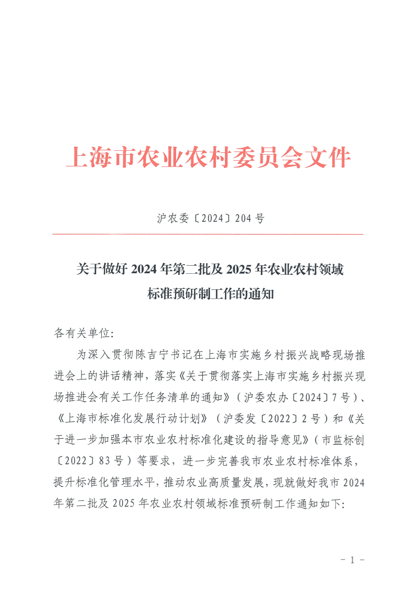 为深入贯彻陈吉宁书记在上海市实施乡村振兴战略现场推进会上的讲话精神,落实《关于贯彻落实上海市实施乡村振兴现场推进会有关工作任务清单的通知》(沪委农办〔2024〕7号)、《上海市标准化发展行动计划》(沪委发〔2022〕2号)和《关于进一步加强本市农业农村标准化建设的指导意见》(市监标创〔2022〕83号)等要求,进一步完善我市农业农村标准体系,提升标准化管理水平,推动农业高质量发展,现就做好我市2024年第二批及2025年农业农村领域标准预研制工作通知如下: