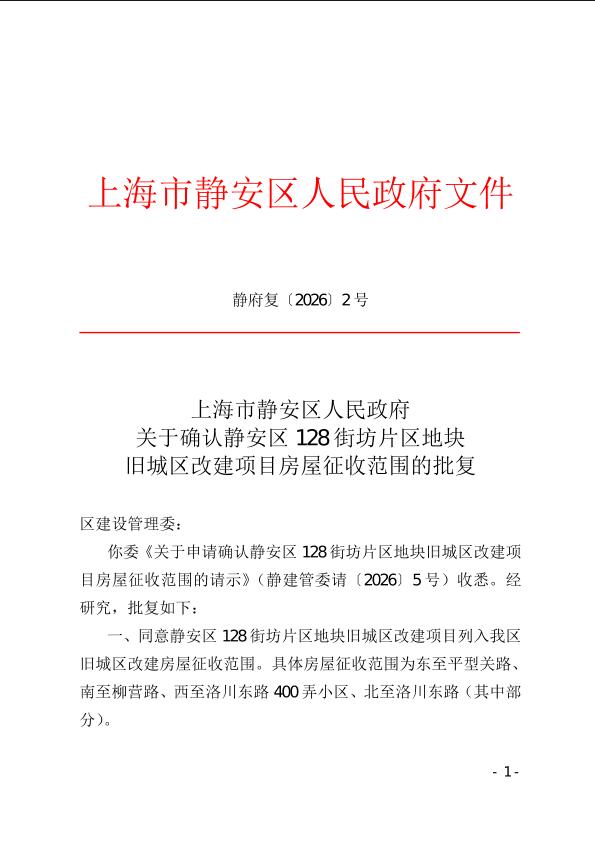 你委《关于申请确认静安区128街坊片区地块旧城区改建项目房屋征收范围的请示》(静建管委请〔2026〕5号)收悉。经研究,批复如下: