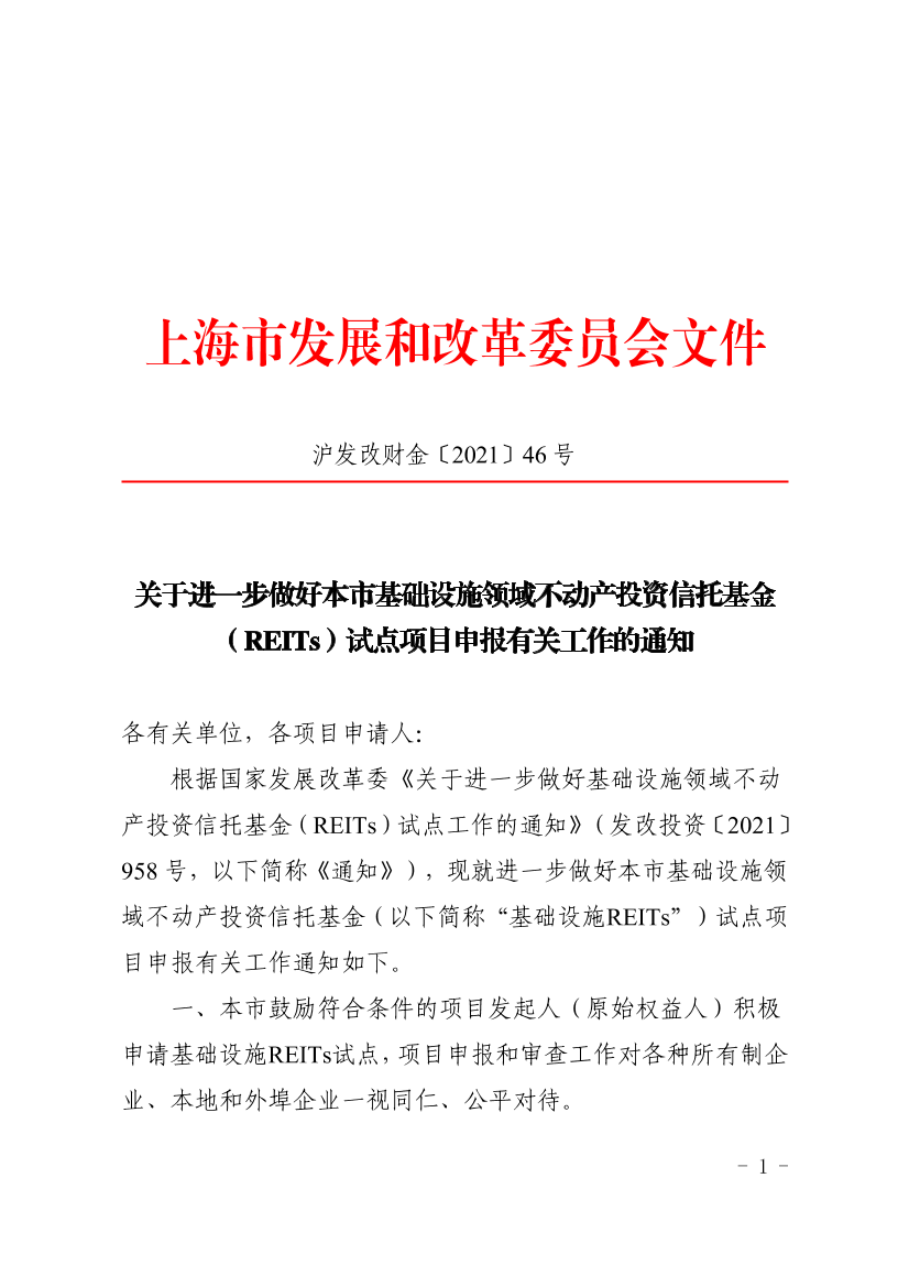 根据国家发展改革委《关于进一步做好基础设施领域不动产投资信托基金(REITs)试点工作的通知》(发改投资〔2021〕958号,以下简称《通知》),现就进一步做好本市基础设施领域不动产投资信托基金(以下简称“基础设施REITs”)试点项目申报有关工作通知如下。