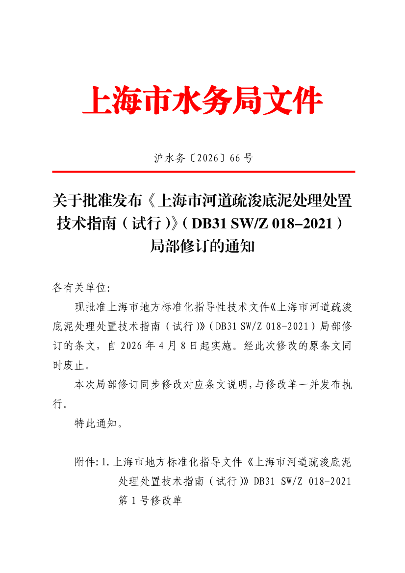 现批准上海市地方标准化指导性技术文件《上海市河道疏浚底泥处理处置技术指南(试行)》(DB31 SW/Z 018-2021)局部修订的条文,自2026年4月8日起实施。经此次修改的原条文同时废止。