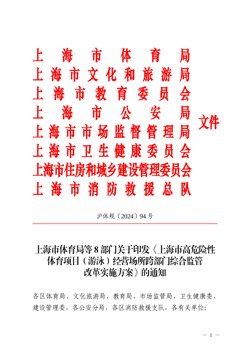 现将《上海市高危险性体育项目(游泳)经营场所跨部门综合监管改革实施方案》印发给你们,请认真贯彻执行。
