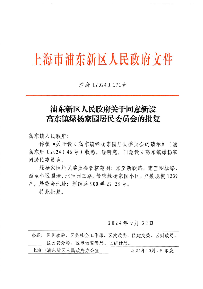 你镇《关于设立高东镇绿杨家园居民委员会的请示》(浦高东府〔2024〕46号)收悉。经研究,同意设立高东镇绿杨家园居民委员会。