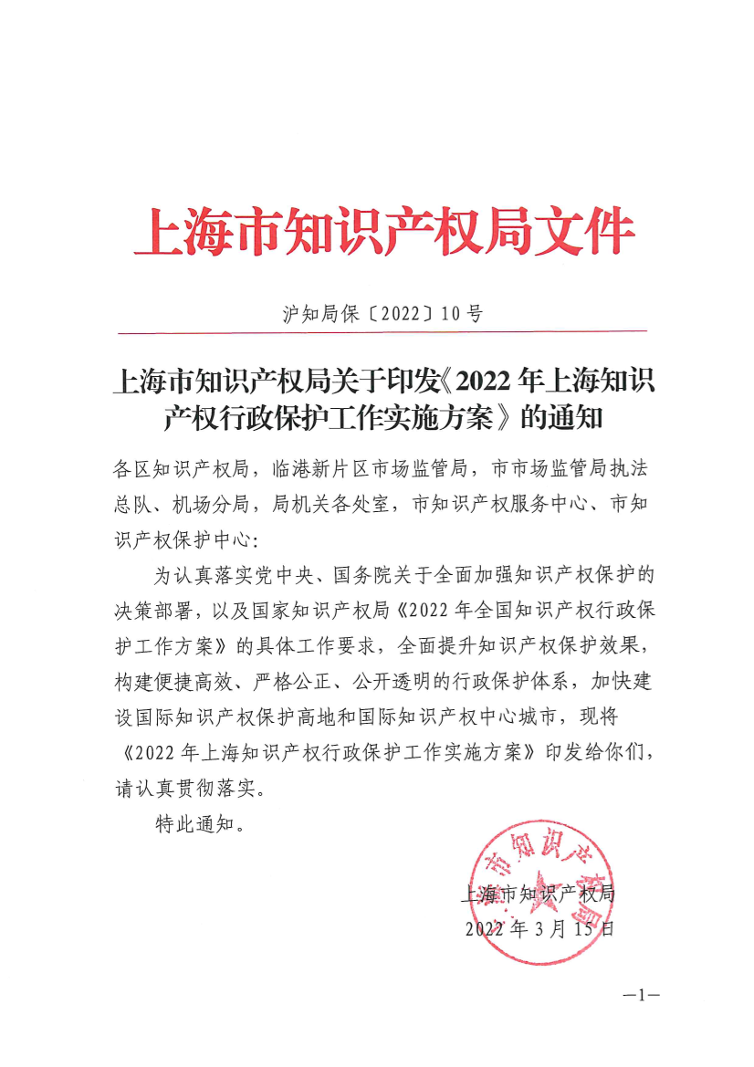 为认真落实党中央、国务院关于全面加强知识产权保护的决策部署,以及国家知识产权局《2022年全国知识产权行政保护工作方案》的具体工作要求,全面提升知识产权保护效果,构建便捷高效、严格公正、公开透明的行政保护体系,加快建设国际知识产权保护高地和国际知识产权中心城市,现将《2022年上海知识产权行政保护工作实施方案》印发给你们,请认真贯彻落实。