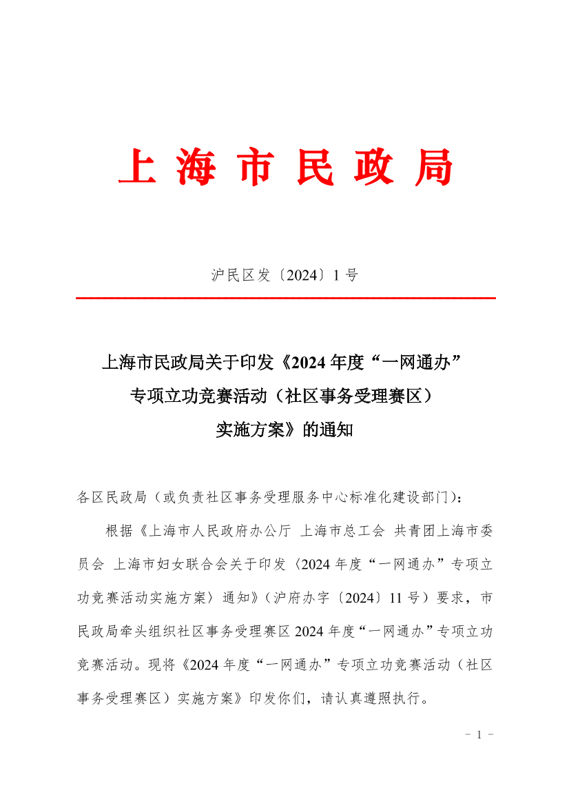 根据《上海市人民政府办公厅 上海市总工会 共青团上海市委员会 上海市妇女联合会关于印发〈2024年度“一网通办”专项立功竞赛活动实施方案〉通知》(沪府办字〔2024〕11号)要求,市民政局牵头组织社区事务受理赛区2024年度“一网通办”专项立功竞赛活动。现将《2024年度“一网通办”专项立功竞赛活动(社区事务受理赛区)实施方案》印发你们,请认真遵照执行。