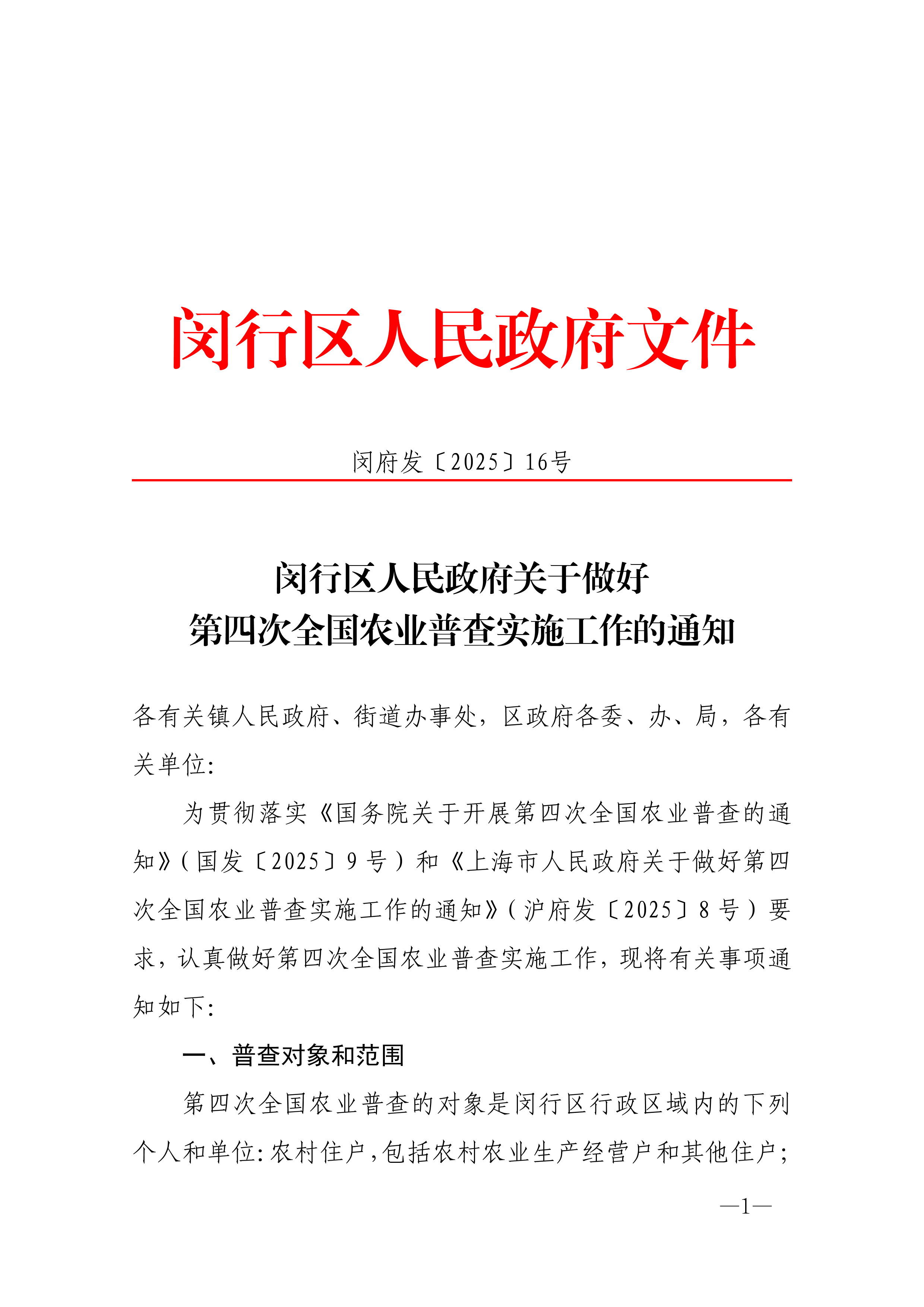 为贯彻落实《国务院关于开展第四次全国农业普查的通知》(国发〔2025〕9号)和《上海市人民政府关于做好第四次全国农业普查实施工作的通知》(沪府发〔2025〕8号)要求,认真做好第四次全国农业普查实施工作,现将有关事项通知如下: