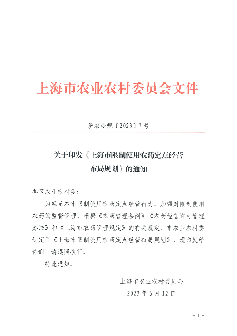 为规范本市限制使用农药定点经营行为,加强对限制使用农药的监督管理,根据《农药管理条例》《农药经营许可管理办法》和《上海市农药管理规定》的有关规定,市农业农村委制定了《上海市限制使用农药定点经营布局规划》,现印发给你们,请遵照执行。