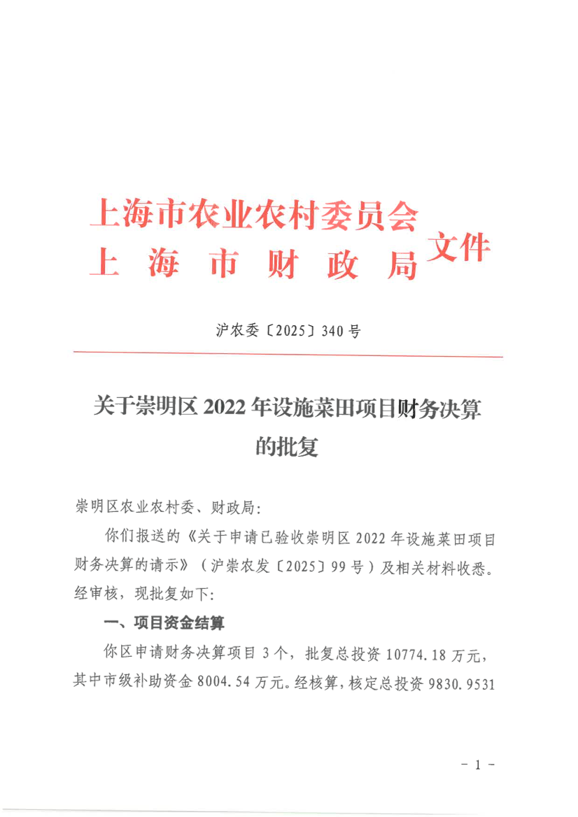 你们报送的《关于申请已验收崇明区2022年设施菜田项目财务决算的请示》(沪崇农发〔2025〕99号)及相关材料收悉。经审核,现批复如下: