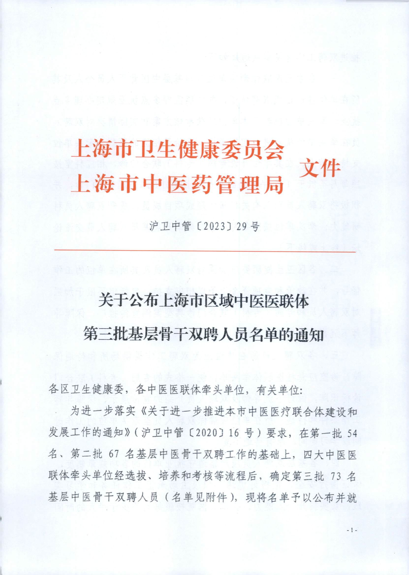 为进一步落实《关于进一步推进本市中医医疗联合体建设和发展工作的通知》(沪卫中管〔2020〕16号)要求,在第一批54名、第二批67名基层中医骨干双聘工作的基础上,四大中医医联体牵头单位经选拔、培养和考核等流程后,确定第三批73名基层中医骨干双聘人员(名单见附件),现将名单予以公布并就推进双聘工作有关事项通知如下: