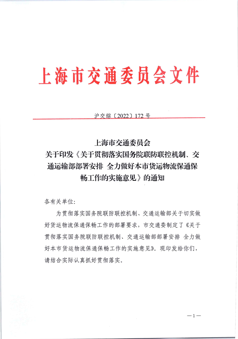为贯彻落实国务院联防联控机制、交通运输部关于切实做好货运物流保通保畅工作的部署要求,市交通委制定了《关于贯彻落实国务院联防联控机制、交通运输部部署安排 全力做好本市货运物流保通保畅工作的实施意见》。现印发给你们,请结合实际认真抓好贯彻落实。