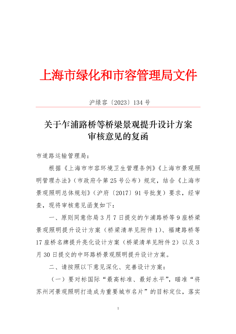 一、原则同意你局3月7日提交的乍浦路桥等9座桥梁景观照明提升设计方案(桥梁清单见附件1)、福建路桥等17座桥名牌提升亮化设计方案(桥梁清单见附件2)以及3月30日提交的中环路桥景观照明提升设计方案。